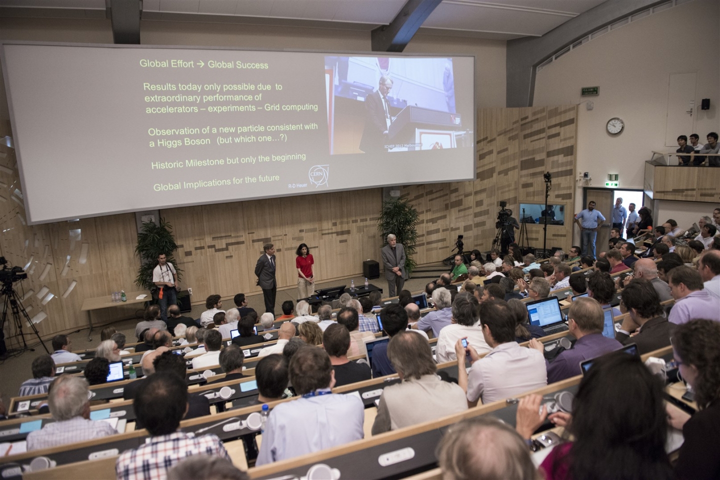 Le 4 juillet 2012, les porte-paroles de ATLAS et CMS annonçaient la découverte d'une particule dont les caractéristiques étaient compatibles avec celles du boson de Higgs recherché depuis de nombreuses années. (Image: Maximilien Brice, Laurent Egli/CERN)