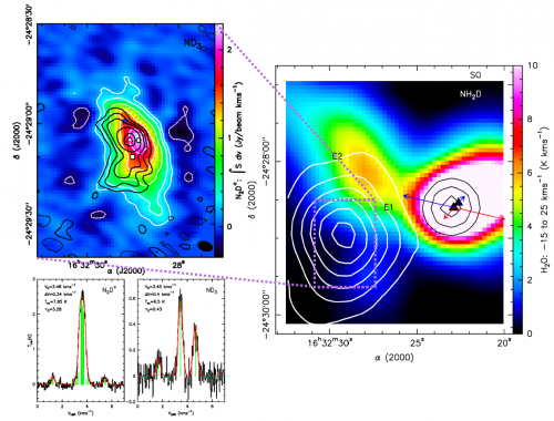 (A droite) Image couleur de l'intensité intégrée de la raie d'émission de l'eau dans L1689N observée avec HIFI, traçant le flot moléculaire, avec les contours blancs superposés de l'intensité intégrée de l'émission NH2D, qui révèle l'emplacement du noyau pré-stellaire. La proto-étoile proche de type solaire IRAS 16293-2422, origine du flot moléculaire, est représentée par les contours noirs de l'émission excitée de SO. Les flèches rouges et bleues marquent les directions du flot compact en molécule CO. (En haut à gauche) Intensité intégrée de la raie de N2D+ dans L1689N observée avec ACA (image en couleurs et contours blancs), avec superposition des contours noirs de l'émission ND3. (En bas à gauche) Spectres N2D+ et ND3 observés avec ACA (panneaux gauche et droit, respectivement) vers les pics d'émission respectifs. La structure hyperfine ajustée est indiquée en rouge.