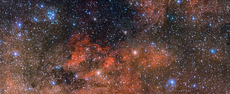 Les sombres ruelles qui serpentent au travers de ce paysage stellaire consistent en d'obscurs filaments de poussière cosmique qui bloquent la lumière en provenance des lointaines étoiles. Les pâles nuages de gaz brillant qui semblent onduler entre les étoiles sont composés de gaz d'hydrogène ionisé. La brillance de ce gaz résulte de son ionisation, soit de l'extraction de ses électrons par le puissant rayonnement ultraviolet émis par les jeunes étoiles extrêmement chaudes. Si les bonnes conditions sont réunies, cette matière peut s'effondrer sur elle-même et alimenter la Voie Lactée avec une nouvelle génération d'étoiles - le processus de formation stellaire pouvant ainsi se poursuivre indéfiniment (eso1535).