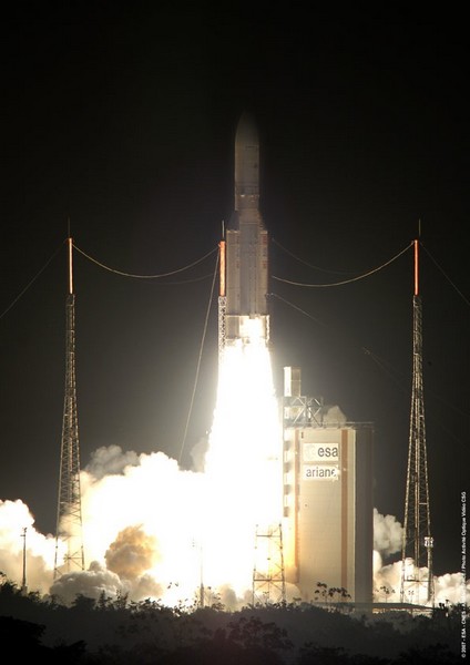 Comme prévu, le lanceur Ariane 5 ECA s'est élancé cette nuit depuis son pas de tir de Kourou, à 01h44 précise, heure de Paris. Deux satellites de télécommunication à son bord: l'américain SPACEWAY 3 et le japonais BSAT-3a pour une charge totale d'environ huit tonnes.