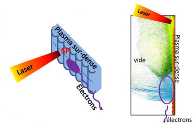 Aujourd'hui, les enjeux concernent l'augmentation du courant des électrons accélérés et l'amélioration du contrôle de la qualité des faisceaux produits, dans le but de développer des applications, notamment dans le domaine médical. Un pas vient d'être réalisé dans cette direction par des physicien-ne-s du Laboratoire des Solides Irradiés, du Laboratoire Interactions, Dynamiques et Lasers et du Centre de Physique Théorique qui viennent d'obtenir un faisceau d'électrons énergétique et dense à l'excitation d'une onde plasma de surface localisée à l'interface entre l'air et un plasma surdense. Dans cette configuration, les électrons sont accélérés par le champ de l'onde de surface, localement plus intense que celui du laser qui ne pénètre pas dans le plasma. Des paquets d'électrons ayant une énergie d'une dizaine de mégaélectronvolts ont été obtenus avec des intensités lasers faiblement relativistes. Ce travail est l'aboutissement d'un long travail de modélisation théorique et numérique qui a permis aux chercheurs de déterminer la structuration de la surface de la cible, couplant de manière optimale l'impulsion laser aux ondes de surface, en l'occurrence, une modulation de la surface avec une période de l'ordre du micromètre. Ces travaux ont vu leur concrétisation expérimentale grâce au développement récent de nouvelles techniques, comme celle du “miroir plasma”, qui permettent de générer des impulsions laser s'allumant suffisamment rapidement pour que l'onde de surface soit excitée avant que la structure de surface ne soit détruite. Ce travail est publié dans la revue Physical Review Letters.