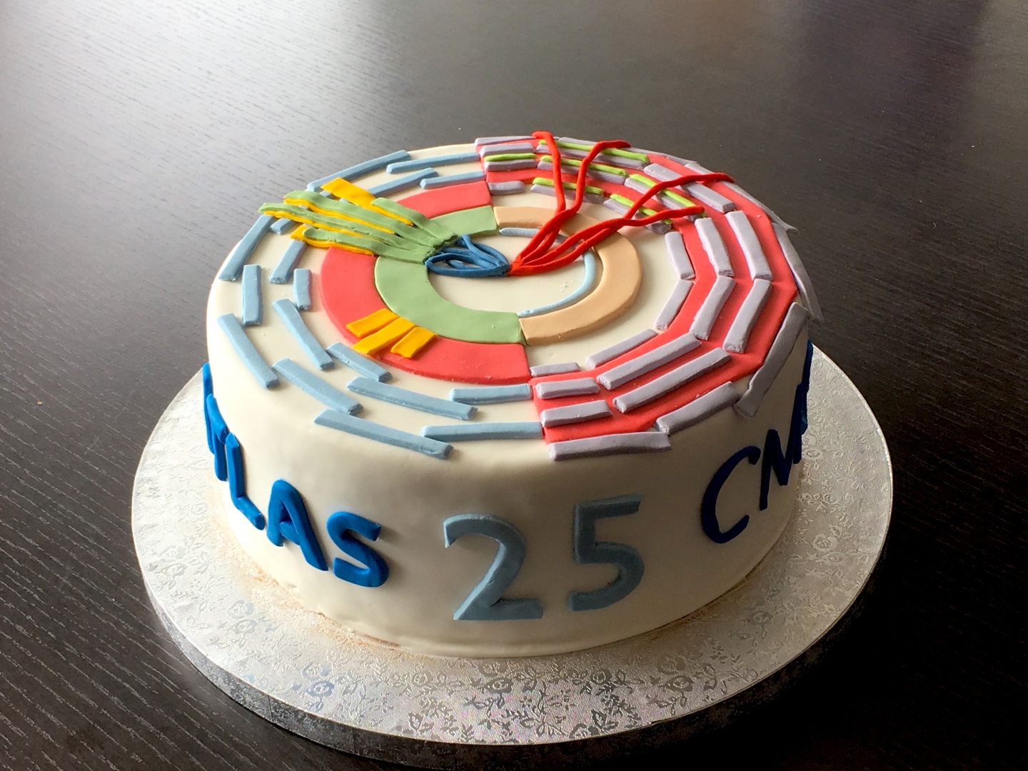 Gâteau d'anniversaire pour ATLAS et CMS spécialement préparé par Katharine Leney, membre de la collaboration ATLAS. Le glaçage représente un événement (collision) dans chaque détecteur. (Image: CERN)