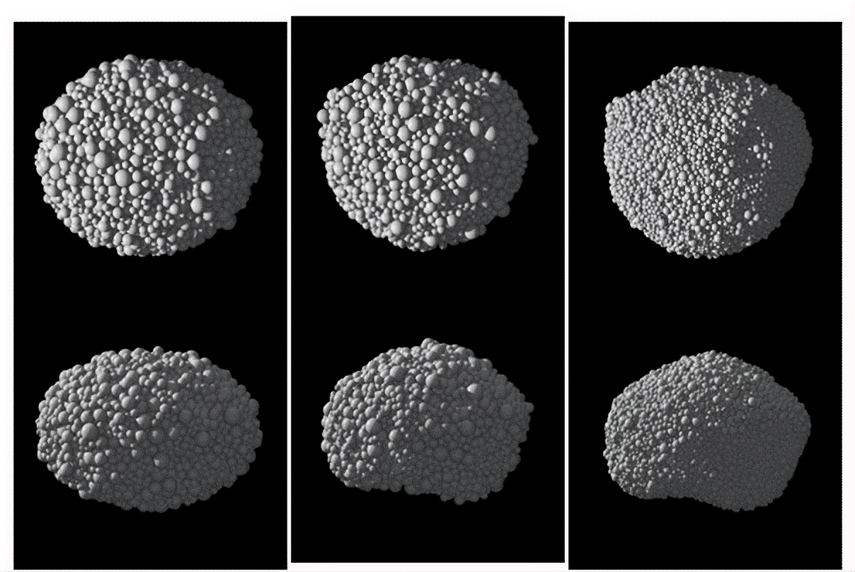Issu de la figure 3 de l'article: Représentations des modèles "agglomérats de roches" de Phobos utilisés dans cette étude. Ligne supérieure: Vue de dessus, depuis le pôle de rotation de Phobos, avec Mars orientée vers la gauche. Ligne inférieure: Vue profil, où la caméra suit l'orbite de Phobos et Mars reste à gauche.
