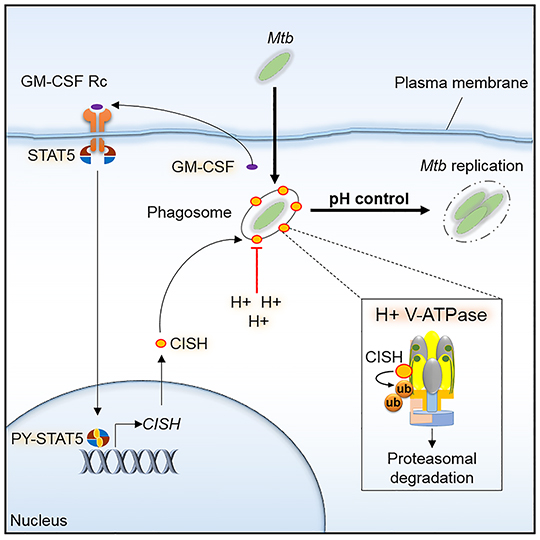 Dans le cas de Mycobacterium tuberculosis, responsable de la tuberculose, cette défense était attribuée à un facteur de virulence secrété par la bactérie, agissant au niveau des pompes à protons (V-ATPase) à la surface des phagosomes et permettant précisément de créer un milieu intérieur acide hostile. Des recherches menées par l'équipe de Priscille Brodin (Institut Pasteur de Lille et de Corée) en collaboration avec Edouard Yeramian et l'équipe de Roland Brosch à l'Institut Pasteur de Paris, et Akihiko Yoshimura à l'Université Keio à Tokyo, révèlent que pour lutter contre la défense acide M. tuberculosis a "plus d'un tour dans ses manches". De fait il apparaît que M. tuberculosis peut détourner à son profit une voie cellulaire de l'hôte, afin d'induire l'expression de la protéine CISH (membre de la famille de protéines SOCS, impliquées dans les régulations immunitaires), s'attachant alors à une sous-unité spécifique de la pompe à protons et conduisant à sa dégradation.