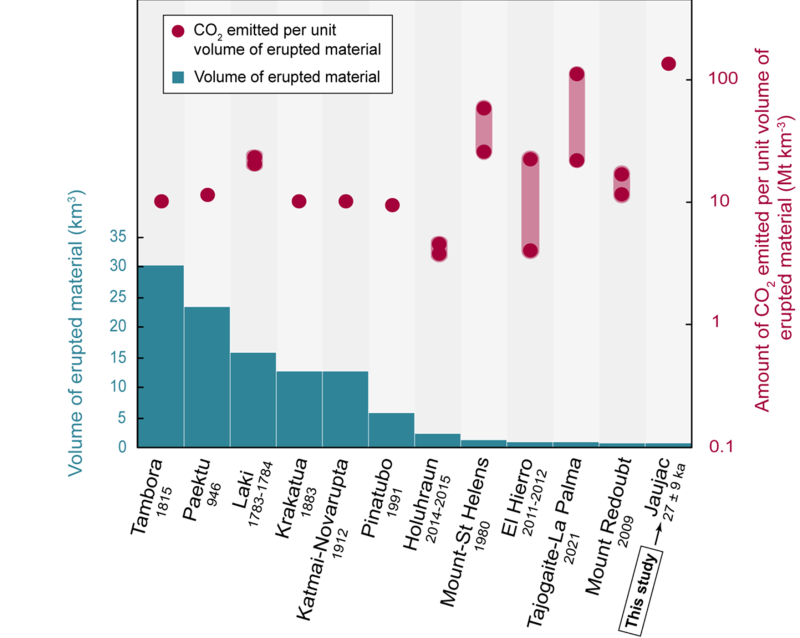 L'analyse de gouttelettes de magma piégées dans les cristaux révèlent que l'éruption de ces volcans s'accompagne d'émissions massives de CO₂, contribuant de manière significative aux flux de CO₂ vers l'atmosphère dans le cycle du carbone sur Terre.