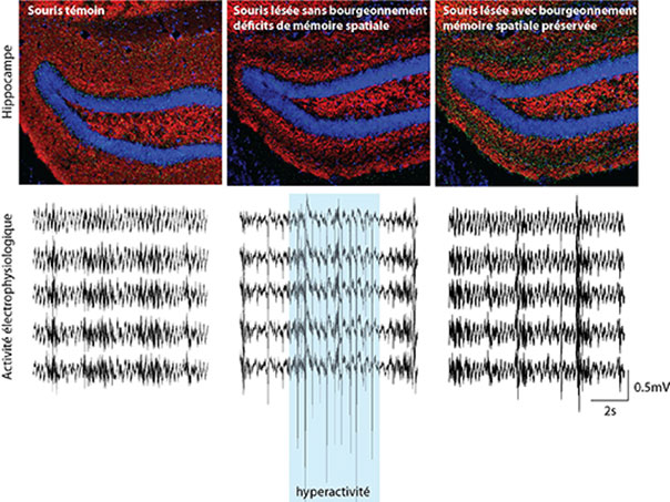 Les chercheurs du Laboratoire des Neurosciences Cognitives et Adaptatives ont pu démontrer que l'apparition de ce bourgeonnement est associée à la restauration des capacités de mémoire spatiale chez des souris lésées ayant perdu la moitié de leurs neurones entorhinaux. Le rôle compensateur du bourgeonnement cholinergique soupçonné depuis longtemps est donc enfin démontré. Ce résultat est crucial car il suggère que le bourgeonnement cholinergique repéré dans le cerveau de patients à un stade très précoce de la MA permet à leur cerveau de réduire l'impact des premières dégénérescences corticales sur le fonctionnement de la mémoire. Sachant que les patients porteurs de l'allèle APOE4 du gène de l'apolipoprotéine E présentent un déclin plus marqué de leur performance de mémoire spatiale que ceux porteur de l'allèle APOE3, les chercheurs ont comparé les effets des deux allèles sur cette forme de compensation chez la souris. Confirmant l'effet néfaste de l'APOE4, les souris APOE4 lésées n'ont pas présenté de bourgeonnement cholinergique et leur mémoire spatiale est restée déficitaire, alors que les souris lésées APOE3 présentent un bourgeonnement et récupèrent leur capacité de mémoire spatiale. L'effet de l'allèle apoE4 est plus marqué chez les souris mâles que chez les souris femelles suggérant une influence bénéfique des hormones féminines. En recherchant le mécanisme à l'origine de l'effet compensatoire du bourgeonnement, les chercheurs ont tout d'abord mis en évidence l'installation d'une hyperactivité dans l'hippocampe lorsqu'il est partiellement déconnecté du cortex entorhinal. Ils ont ensuite montré que la stimulation optogénétique des fibres du bourgeonnement normalise l'activité de l'hippocampe chez des souris lésées dont les neurones cholinergiques ont été génétiquement modifiés pour être sensibles à la lumière. L'augmentation de la modulation cholinergique est donc au coeur de l'action bénéfique du bourgeonnement sur le syndrome de déconnection de l'hippocampe.