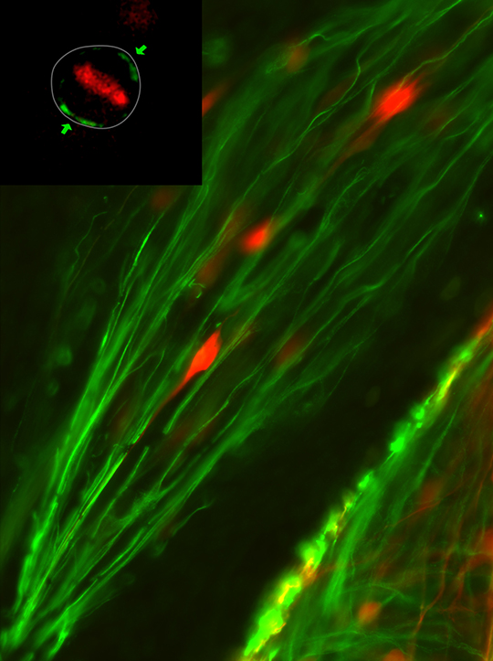 Pour construire leur réseau de connexions nerveuses, les neurones élaborent des prolongements qui leur confèrent des morphologies complexes, caractéristiques de leur sous-type. Les cellules-mères à l'origine de ces neurones possèdent également des prolongements, qui sont rétractés lors de la division cellulaire. Les chercheurs ont montré que pendant la division cellulaire, la cellule-mère garde une trace de sa morphologie en accumulant des protéines (1) aux sites de rétraction de ses prolongements.
