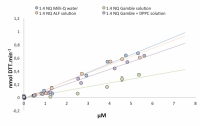 Cinétique de consommation du DTT (substitut d'anti-oxydant permettant de mesurer le potentiel oxydant) en fonction de la concentration molaire de 1, 4 Naphtoquinone (un composé redox-actif contribuant significativement au PO des aérosols sous nos latitudes) dans 4 milieux d'extractions (ALF, Gamble et Gamble +DPPC sont des fluides pulmonaires reconstitués et sont comparés avec une extraction à l'eau). Les barres d'erreurs correspondent aux déviations standards des triplicats.