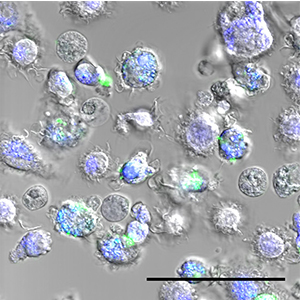 Des macrophages avec en vert les nanoparticules. ©Laboratoire Bourquin - UNIFR/UNIGE