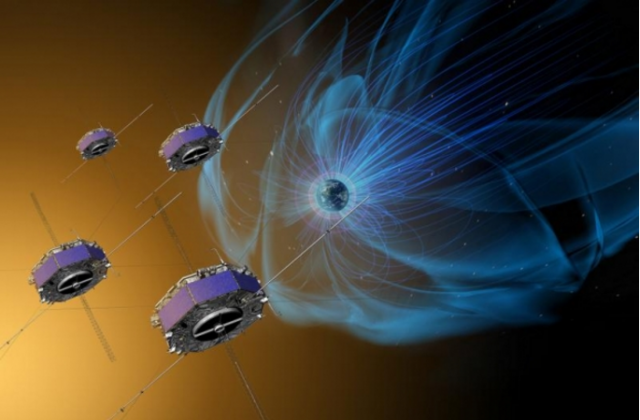 Vue d'artiste de la mission MMS dédiée à l'étude de la magnétosphère terrestre. Crédit: NASA