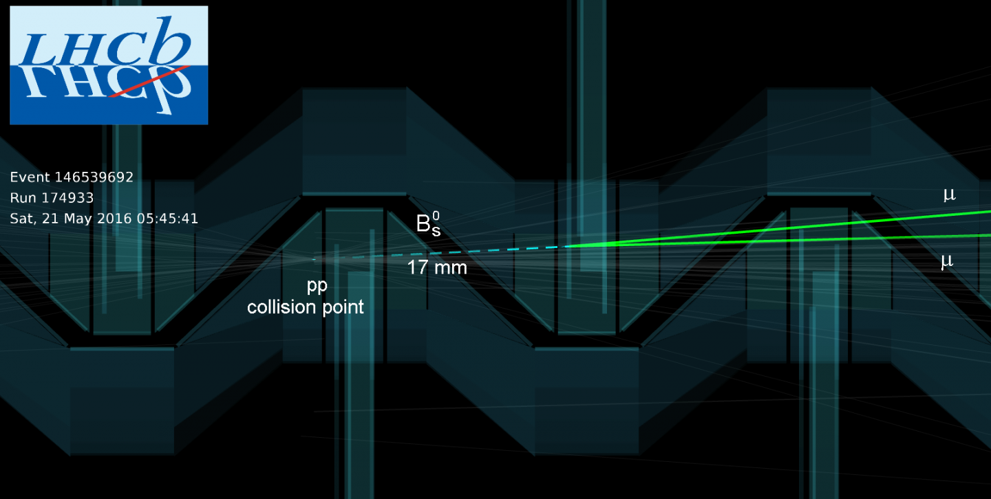 La collaboration LHCb a rapporté l'observation de la désintégration du méson BS^0 (particule lourde formée d'un antiquark b et d'un quark s) en deux muons. Cette désintégration est en fait la plus rare jamais observée pour cette particule : d'après les prédictions théoriques, elle devrait avoir lieu environ trois fois sur un milliard de collisions.