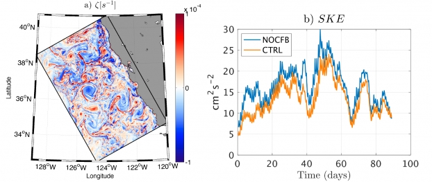 a) Configuration des simulations couplées océan-atmosphère illustrée par un instantané de vorticité relative à la surface de l'océan. La résolution spatiale du modèle océanique est de 500 m, celle du modèle atmosphère de 2 km. b) Évolution temporelle de l'énergie cinétique à sous-mésoéchelle moyennée dans le domaine illustré sur (a). CTRL (NOCFB, pour No Current FeedBack) représente une simulation qui prend (ne prend pas) en compte la rétroaction mécanique.
