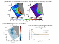 À mésoéchelle (10-250 km), il a été montré que les rétroactions océan-atmosphère aussi bien thermiques (influence de la température de surface de la mer) que mécaniques (influence des courants de surface) ont un impact significatif sur l'atmosphère ainsi que sur la dynamique océanique. En particulier, l'interaction mécanique induit une large réduction de l'activité à mésoéchelle de l'océan (~30-40 %). Quant aux interactions air-mer à sous-mésoéchelle, elles ne sont pas bien connues du fait de leur extension spatiale réduite qui représente une barrière observationnelle et un défi numérique.