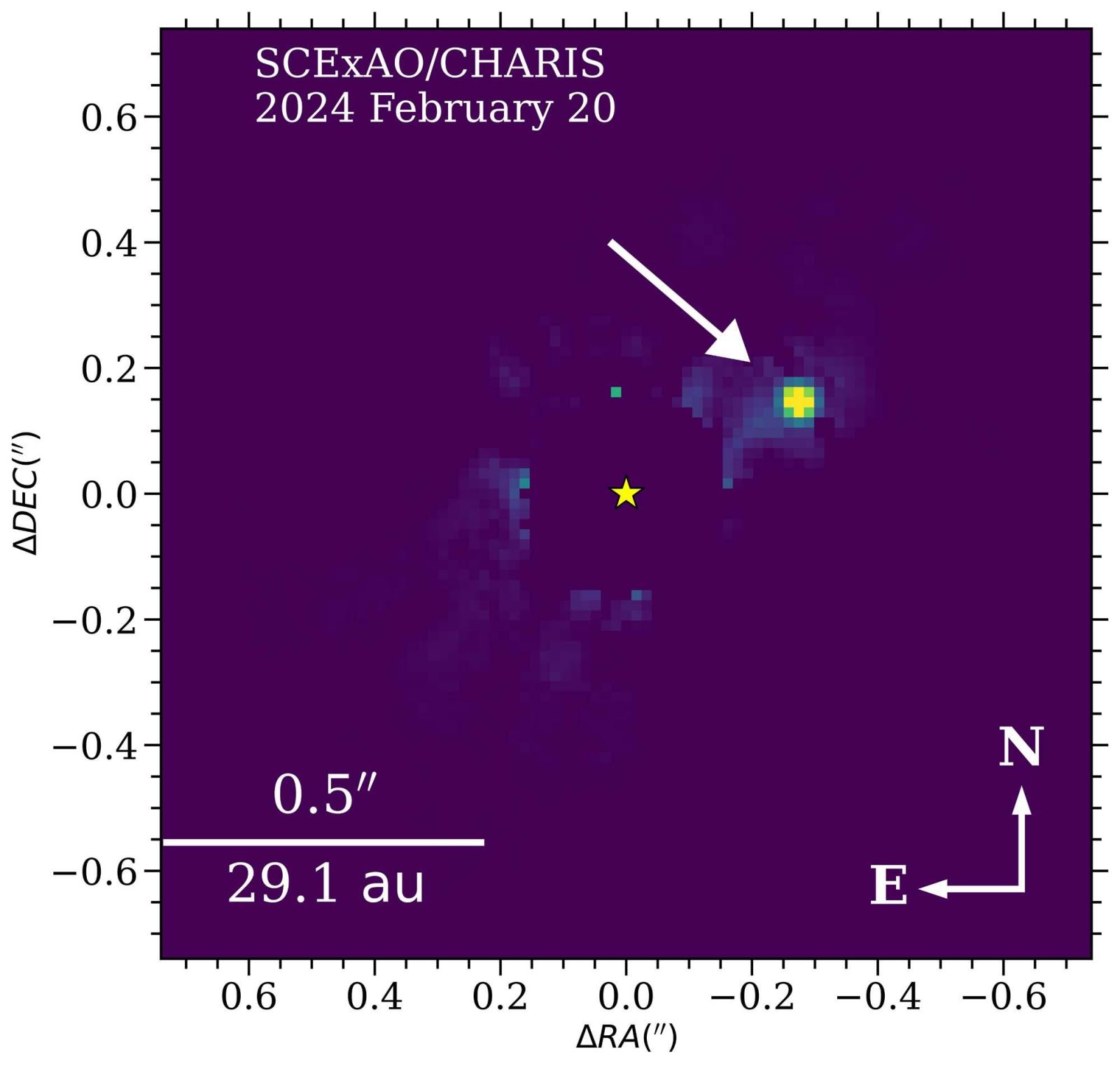 Image de HIP 71618 B (indiquée par la flèche) prise par le télescope Subaru. L'étoile hôte de la planète est masquée sur cette image. Sa position est indiquée par le symbole d'étoile. L' image haute résolution et l' image sans texte sont disponibles via les liens. Crédit: T. Currie/Télescope Subaru, UTSA