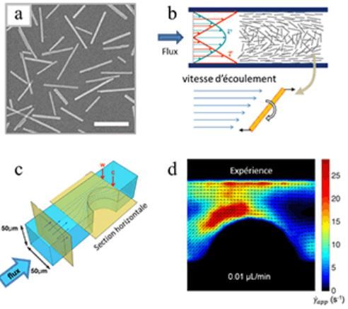 a: image de microscopie électronique à balayage des nanobâtonnets de LaPO4 b: schéma montrant l'alignement des nanobâtonnets dans un écoulement sous l'effet des forces de cisaillement c: Schéma d'un canal microfluidique ayant été étudiée d: cartographie du champ de cisaillement dans le fluide en écoulement