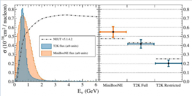 Les neutrinos peuvent interagir avec les nucléons contenus dans la matière des détecteurs de différentes façons. La réaction la plus fréquente à l'énergie des neutrinos de T2K (~600 MeV) est celle dite de "courant chargé quasi-élastique", où le neutrino se transforme en lepton chargé et le neutron se transforme en proton: ?? + n ? ?- + p+. C'est la section efficace de ce dernier processus que l'équipe T2K du SPP a mesurée dans le détecteur proche ND280 : ? = (0.417±0.005±0.047) 10-38 cm2/nucléon. Si l'énergie des neutrinos est plus élevée, d'autres particules sont créées en plus du muon et du proton, surtout des pions. Les interactions avec production de pions sont le bruit de fond principal dans la mesure de section efficace et ils ont été éliminés conservant une haute efficacité sur le signal grâce aux très bonnes performances des Chambres à Projection Temporelle (TPCs) de ND280 qui ont été conçues, construites et mises en œuvre par une équipe conjointe SPP-SEDI.