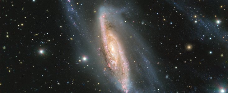 périphérie. Sous l'effet gravitationnel d'une probable rencontre galactique passée, cette structure spirale paraît étirée vers l'extérieur de la galaxie.