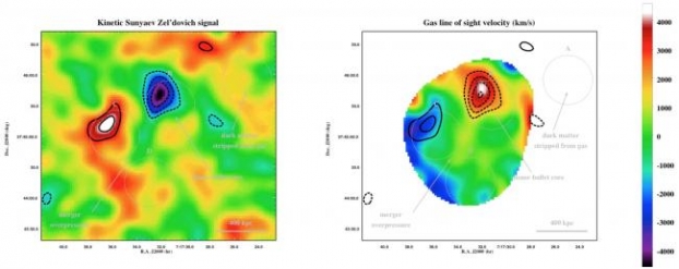 Cette cartographie kSZ fournit la quantité de mouvement du gaz intégrée sur la ligne de visée par rapport au cadre de référence du CMB; c'est donc une mine d'informations pour comprendre la physique des amas en fusion. Les données ont révélé que les deux sous-amas principaux de MACS J0717.5+3745, à savoir B et C (Figure 1), sont en train de tomber l'un sur l'autre avec une très grande quantité de mouvement (Figure 2, à gauche). Rémi Adam souligne: "la simple détection de l'effet kSZ est déjà un excellent résultat en soi, mais quand nous avons réalisé que nous étions en mesure d'en obtenir une carte, ce fut un succès considérable pour nous".