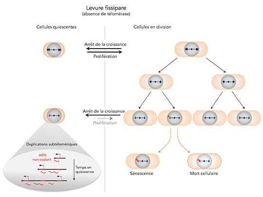 Les mécanismes de maintenance des télomères sont bien étudiés dans les cellules en division mais restent peu connus dans des cellules quiescentes (qui ne se divisent pas). Il a été montré que des dommages sur l'ADN peuvent engendrer un raccourcissement des télomères des cellules quiescentes, notamment dans les neurones et les cellules musculaires. Les chercheurs ont posé la question du devenir des télomères dysfonctionnels dans les cellules quiescentes. Afin d'étudier les mécanismes qui régissent la maintenance des télomères courts dans les cellules quiescentes, ils ont utilisé des cellules de levure dont la quiescence peut être induite métaboliquement. Alors que les télomères d'une souche sauvage sont stables en quiescence, ils ont observé que des télomères érodés sont fortement réarrangés en absence de télomérase. De façon inattendue pour des cellules quiescentes, ces réarrangements correspondent à des duplications de régions subtélomériques.