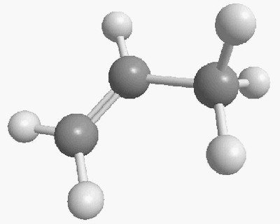 La molécule de propylène. Les atomes de carbone sont représentés par des sphères gris foncé, ceux d'hydrogène par des sphères gris clair