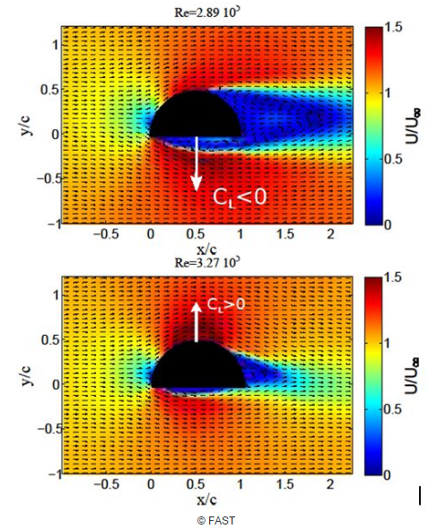 Les chercheurs ont utilisé des objets de diverses formes non symétriques, par exemple un demi-cylindre placé dans un écoulement horizontal, face arrondie vers le haut. Par des techniques d'imagerie laser, ils ont observé que les lignes d'écoulement se modifient brutalement à partir d'une certaine vitesse. Cela provoque en même temps les crises de traînée et de portance. Jusqu'alors très faible et dirigée vers le bas, la portance change de sens et s'amplifie fortement. Dans le cas présent, il n'y a pas d'angle d'incidence de l'objet et seule l'augmentation de la vitesse déclenche la crise. La mise en évidence de ce phénomène pourrait conduire à diverses applications: détecteurs de vitesse, systèmes de contrôle passif de stabilité ou à des actionneurs, par exemple pour fermer une vanne quand le débit devient trop important dans une conduite.