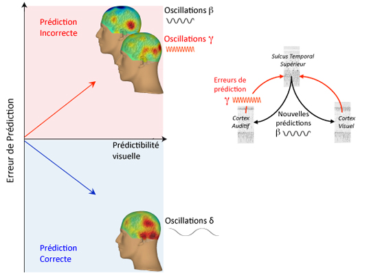 Grace à des enregistrements magnéto-encéphalographiques réalisés chez des sujets humains sains, les chercheurs du LNC et du CRICM montrent que la prédiction correcte d'un son à partir des mouvements labiaux induit une synchronisation de rythmes oscillatoires basse fréquence (delta, 3-4 Hz) entre des aires corticales de haut niveau. Lorsqu'au contraire le stimulus auditif perçu ne correspond pas aux attentes du cerveau (prédiction incorrecte), l'aire cérébrale qui intègre ces informations multisensorielles, le sillon temporal supérieur, génère un signal d'erreur de prédiction. Ce signal se traduit par une transition de l'activité corticale vers un régime couplant des rythmes cérébraux de plus haute fréquence. Alors que le rythme gamma (60-80 Hz) reflète la propagation ascendante de ce signal d'erreur au sein d'aires corticales de bas niveau, le rythme beta (14-16 Hz) reflète la transmission descendante de nouvelles prédictions expliquant les causes probables de ces erreurs.