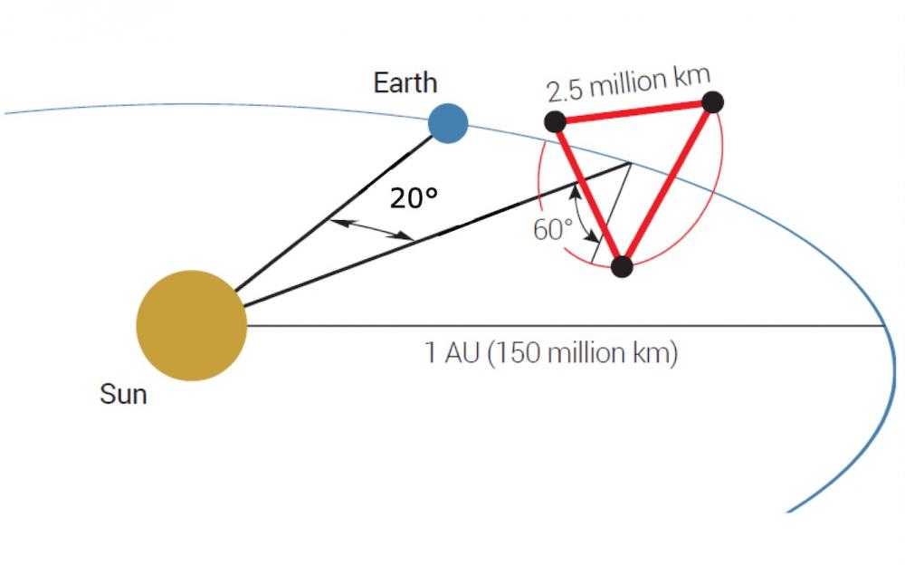 Les trois engins spatiaux de la mission LISA formeront un triangle en orbite, avec des côtés de 5 millions de kilomètres et positionnés derrière la Terre sur son orbite. Ils suivront des orbites similaires à celle de la Terre, minimisant les changements de longueur dés cotés du triangle.
