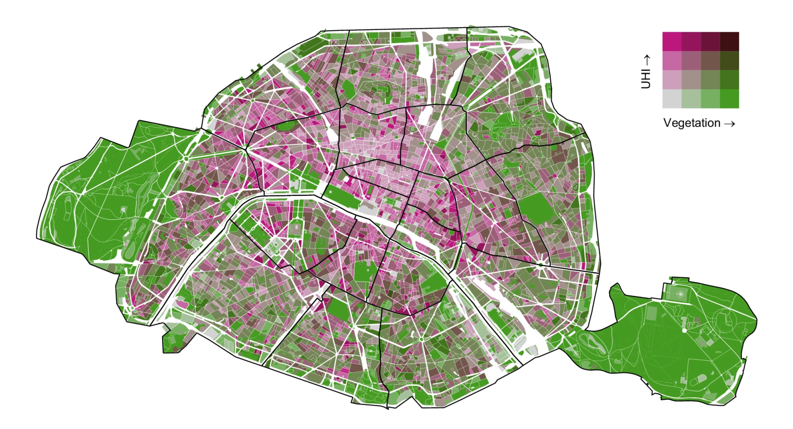 Relation géographique entre le taux de végétation et le potentiel de développement d'un îlot de chaleur urbain (ICU) diurne à Paris.
