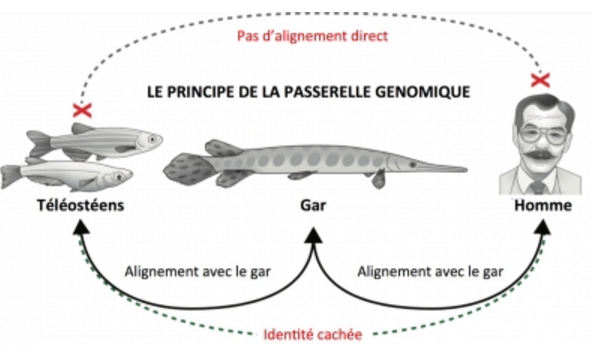 Les comparaisons entre l'homme et le gar sont ainsi simplifiées car le gar n'a pas toutes les copies de gènes supplémentaires trouvées chez le poisson zèbre suite à la duplication du génome chez les poissons téléostéens. Les chercheurs de l'Inra de Rennes ont comparé l'évolution de l'expression des gènes chez le gar et le poisson zèbre. Après duplication, soit les deux gènes résultant se partagent les fonctions ancestrales, soit l'un des deux gènes se trouve disponible pour acquérir une nouvelle fonction, alors que l'autre conserve les fonctions ancestrales.