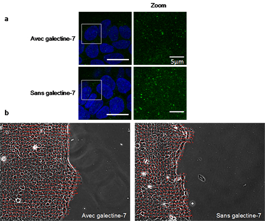 Des analyses de fonctionnalité ont révélé que galectine-7 est une molécule stabilisatrice de la E-cadhérine à la surface cellulaire et qu'elle régule la dynamique de cette protéine en ralentissant son renouvellement. De plus, des expériences de vidéo-microscopie montrent que la présence de galectine-7 renforce l'adhérence intercellulaire et favorise l'acquisition de la polarité avant-arrière des cellules en mouvement, la coordination et la cohérence du mouvement cellulaire (Figure).