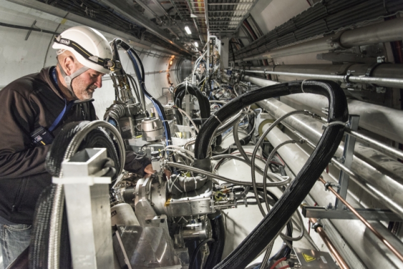 Nicola Turini, porte-parole adjoint de TOTEM, devant l'un des "pots romains" de l'expérience, dans le tunnel du LHC. (Photo: Maximilien Brice/CERN)