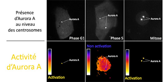 L'équipe "Microscopie de Fluorescence Quantitative" dirigée par Marc Tramier a mis au point un nouveau biosenseur fluorescent permettant de suivre l'activation de la protéine Aurora A, dans le temps comme dans l'espace, au sein même d'une cellule vivante. Cette véritable sonde fluorescente a pour fonction de remplacer la protéine Aurora A originale dans une cellule, sans en changer la physiologie. L'activation d'Aurora A est consécutive à son auto-phosphorylation (ajout d'un phosphate sur un acide aminé de la kinase elle-même) qui induit un changement de conformation de la protéine passant d'un état inactif à un état actif. Pour suivre ce changement de conformation, le biosenseur est constitué de la protéine Aurora A étiquetée en vert et en rouge à ses deux extrémités par des protéines fluorescentes. Lorsque la protéine est activée, les deux extrémités se rapprochent et les deux protéines fluorescentes sont suffisamment proches pour produire un phénomène physique connu sous le nom de FRET (pour "Förster Resonance Energy Transfer"), où la protéine fluorescente verte transfère une partie de sa fluorescence à la protéine fluorescente rouge. En mesurant le FRET, les chercheurs peuvent ainsi savoir où et quand Aurora A s'active durant le cycle cellulaire. Il est alors possible d'observer au microscope l'activation de cette protéine dans les cellules vivantes.
