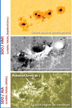 Les éruptions solaires les plus intenses se déclenchent dans la partie supérieure de l'atmosphère solaire - la couronne - au sein de boucles de champs magnétiques et de courants électriques intenses ancrées, plus bas, dans des taches solaires. La région active NOAA 11158 a commencé à apparaître dès le 10 février. Le magnétographe HMI du satellite Solar Dynamics Observatory (SDO) a suivi pendant plusieurs jours la croissance et le déplacement de taches les unes par rapport aux autres (Figure 1). Cette émergence a permis à des champs magnétiques de se déployer dans la couronne, et les mouvements de cisaillement observés ont conduit à y amplifier des courants électriques. Cest ce qu'indiquent l'expansion lente et la géométrie vrillée des boucles magnétiques observées au-dessus des taches par les télescopes AIA de SDO, qui observent continuellement la totalité du Soleil simultanément dans 8 longueurs d'ondes du rayonnement extrême ultraviolet (EUV). Pendant quatre jours, cette région a été le siège de plusieurs éruptions modestes et d'une éruption de taille moyenne.