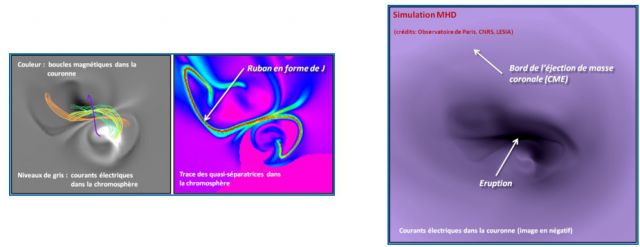 L'analyse dans la simulation des phénomènes de reconnexion magnétique et d'expansion rapide des lignes de champs magnétiques vrillés (Figure 3, gauche) repose sur plusieurs études menées à l'Observatoire de Paris depuis plus de dix ans. Elle s'avère expliquer la géométrie des embrillancements EUV par la reconnexion magnétique dans des "quasi-séparatrices" (Figure 3, milieu), et elle semble indiquer que la propagation de la perturbation issue du site de l'éruption ne serait pas dûe à une onde magnéto-sonore, mais plutôt à la génération de courants électriques sur les bords de l'éjection de masse coronale qui repousse les champs magnétiques environnants (Figure 3, droite).