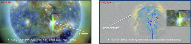Au cours de la phase impulsive de l'éruption, et avant l'éjection de masse coronale, un front de propagation rapide de forme ovale a pu être mis en évidence par traitement des images de SDO (Figure 2, droite). Ces front de propagation sont communément interprétés comme étant la manifestation d'une onde magnéto-acoustique engendrée dans la couronne, soit par le chauffage brutal de l'éruption, soit par l'expansion rapide de l'éjection de matière.