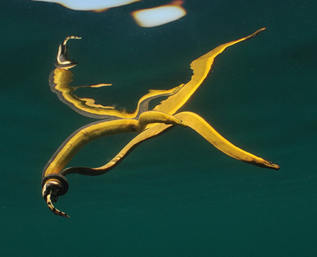 Le serpent marin à ventre jaune (Hydrophis platurus) est un reptile pélagique présent dans tout l'océan Indopacifique tropical. Pour parvenir à peupler un si vaste territoire, l'espèce aurait mis à contribution la force des courants marins. C'est ce qu'a voulu vérifier une équipe franco-américaine dirigée par un chercheur du Centre d'Etudes Biologiques de Chizé (CEBC, CNRS / Université de La Rochelle) à l'aide de modèles de circulation des courants océaniques. L'étude, publiée en août dernier dans Biology Letters, montre que des populations de serpents marins peuvent ainsi se déplacer sur des milliers de kilomètres sans mettre en péril leur survie. Ce mode de dispersion s'avère en outre particulièrement efficace lorsque ces individus entament leur périple depuis le probable berceau d'H. platurus. En misant sur une stratégie risquée, l'espèce serait donc parvenue à conquérir une grande partie de l'océan tropical.