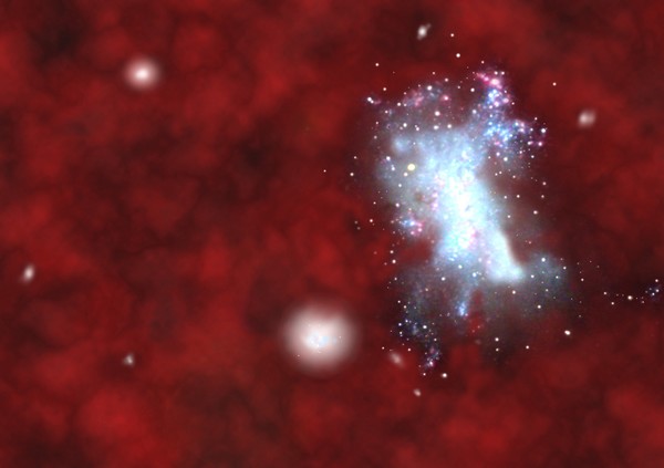 Vue d'artiste d'une galaxie naine primordiale constituée d'étoiles chaudes (bleues) et environnée de gaz hydrogène (rouge)