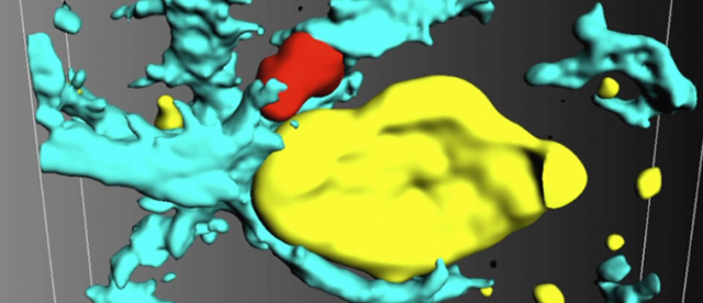 La perte de connexions neuronales (appelées "synapses") résulte d'une interaction entre neurones, cellules T et phagocytes dans un cerveau victime d'inflammation. Le neurone (en jaune) est attaqué par un lymphocyte T (en rouge) et enveloppé par un phagocyte (en bleu) qui dégrade les synapses. (UNIGE)
