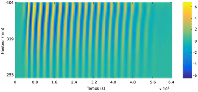 Diagramme spatio-temporel montrant l'écoulement moyen d'un liquide pris entre les deux cylindres du dispositif expérimental (hauteur 404 mm), soumis à des ondes de forçage. La couleur correspond à la vitesse de l'écoulement moyen (en mm/s). On observe qu'il s'inverse toutes les 3000 secondes, une période bien supérieure à celle des ondes de forçage (15 s). @ 2018 American Physical Society