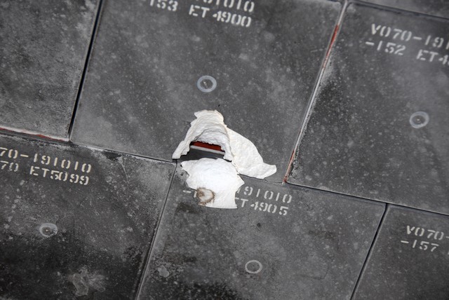 Photo des tuiles endommagées de la Navette prise après l'atterrissage. La NASA avait décidé de ne pas effectuer de réparation en orbite (voir notre news) Cliquer sur l'image pour l'agrandir