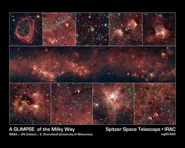 Bien que cette image panoramique couvre une zone étendue de la galaxie, elle ne représente que 7,5% des observations du projet "Glimpse Survey", qui explore la plupart des régions de formation d'étoiles de notre galaxie. Les illustrations sont des photos composites en fausses couleurs sous quatre longueurs d'onde: 3,6 microns (bleu), 4,5 microns (vert), 5,8 microns (d'orange), et 8,0 microns (rouge).