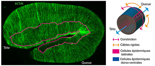 Vers la fin de son développement, l'embryon de C. elegans passe d'une forme ovoïde à une forme cylindrique. Il s'étire pour devenir quatre fois plus long dans l'axe tête-queue (ou antéro-postérieur) et environ deux fois plus petit en diamètre. Ce processus nécessite un moteur moléculaire appelé myosine, aussi connu pour son rôle dans les contractions musculaires, et un réseau de polymères appelé actine qui confère aux cellules leurs propriétés mécaniques. Ces molécules agissent dans l'épiderme de C. elegans,qui est organisé en cellules dorsales, ventrales et deux rangées de cellules latérales qui relient les cellules dorsales et ventrales, l'activité des moteurs de myosine se concentrant seulement dans les deux rangées de cellules latérales sur les deux côtés de l'embryon. Les chercheurs ont étudié comment cette distribution des moteurs myosine allonge l'embryon spécifiquement dans la direction antéro-postérieure.