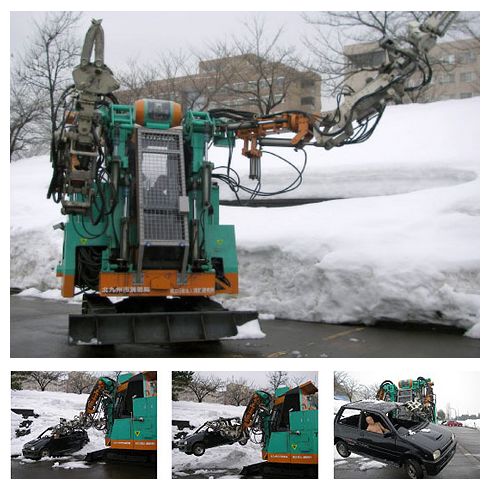 La robot Enryu dégageant une voiture et ses occupants de la neige