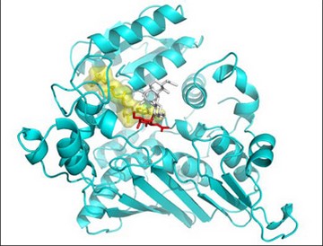 Vue générale de la structure moléculaire de la N-acétylgalactosaminidase d'Elizabethkingia meningosepticum en complexe avec le cofacteur NAD+ (en jaune) et l'antigène A présent à la surface des globules rouges du type A. La molécule de Nacétylgalactosamine qui est reconnue et hydrolysée par l'enzyme apparaît en rouge