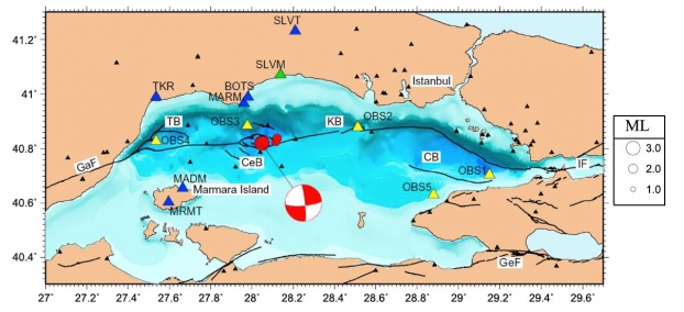 Localisation des événements répétitifs (en rouge) dans la mer de Marmara au cours de la période 2008-2015, ainsi que des OBS permanents de KOERI (2011-2012) (triangles jaunes), des stations régionales proches (triangles bleus) et des autres stations sismiques régionales (triangles noirs). D'ouest en est, les bassins le long de la faille de Marmara (MMF) sont: Tekirdag (TB), Bassin Central (CeB), Kumburgaz (KB) et Cinarcik (CB). Le mécanisme au foyer d'un des événements répétitifs est détaillé et bien cohérent avec le décrochement dextre de la MMF.