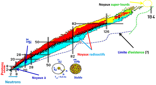 Figure 2: Carte des noyaux connus, représentés en fonction de leur nombre de neutrons (abscisse) et de protons (ordonnée). Elle compte près de 3150 noyaux différents, parmi lesquels seulement ~290 noyaux stables (en noir). Près de 5000 noyaux, la plus grande partie très riches en neutrons sont encore à découvrir, jusqu'aux limites d'existence de la matière nucléaire. Certains appartiennent à la catégorie des noyaux "super-lourds" tout en haut de la carte. Parmi les noyaux radioactifs étudiés en laboratoire, certains comme les noyaux à halo, le lithium-11 en particulier,ou bien encore le silicium-34, présentent des caractéristiques inédites qui permettent d'interroger l'interaction nucléaire forte agissant au coeur du noyau atomique.