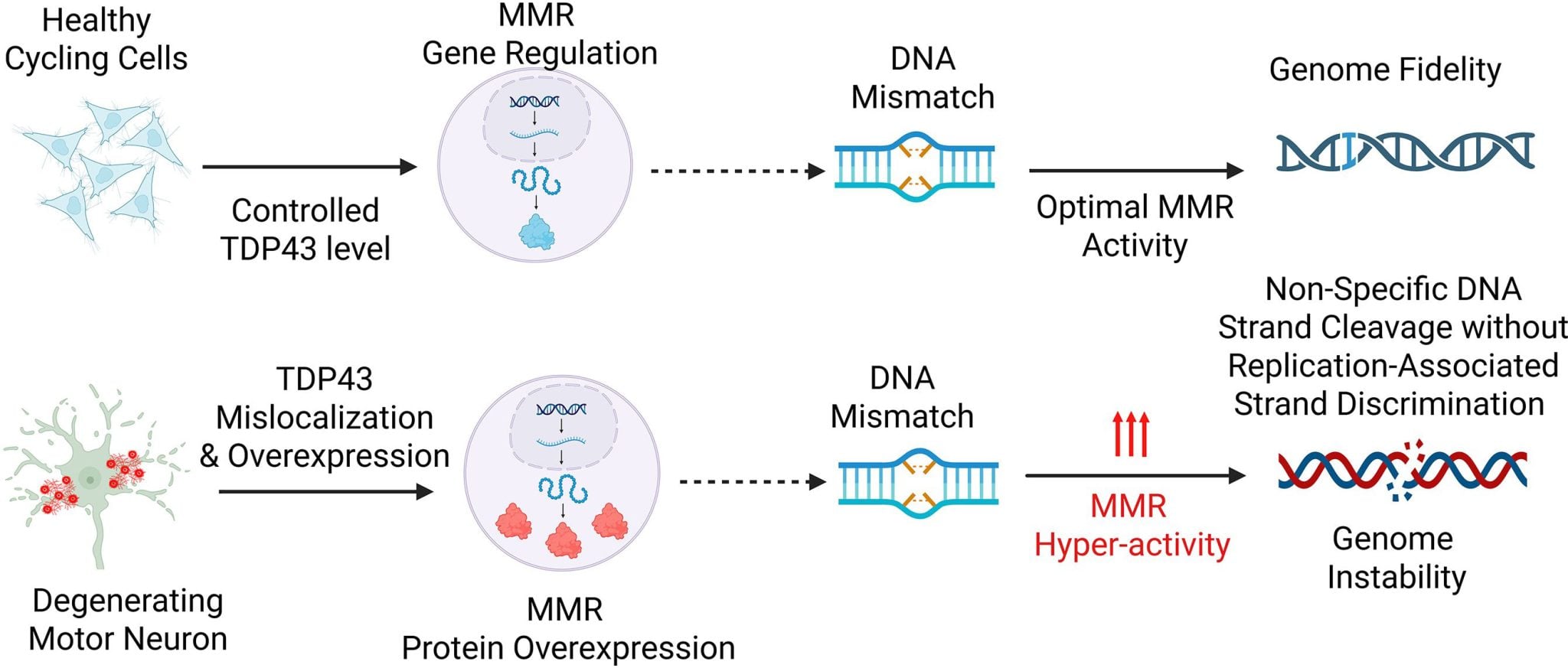 Schéma simplifié du mécanisme étudié, montrant l'influence de TDP43 sur la correction des erreurs de l'ADN. Crédit: Les auteurs, dont Muralidhar L Hegde et Vincent E Provasek