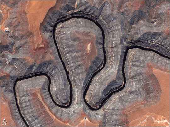 Le long ruban noir sinueux de la San Juan River entaille profondément le paysage de grès rose de l'Utah du sud-est dans cette image acquise par le satellite Ikonos, le 9 mai 2004. Le cours d'eau, qui traverse le Parc d'Etat de Gooseneck, est dominé par des gorges de plus de 300 mètres de haut. Les stries gris clair, roses, et blanches des parois du canyon révèlent seize couches géologiques dont la plus ancienne est âgée de plus de 300 millions d'années.