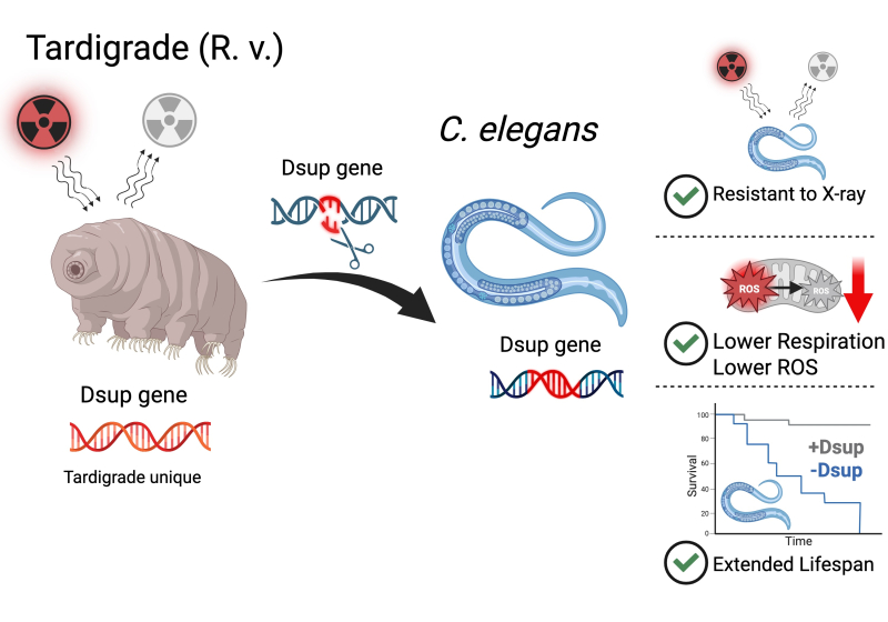 Grâce à une méthode d'insertion précise du gène, ils ont ainsi généré des vers exprimant Dsup sans modifier leur croissance, fertilité ou comportement. Ces vers se sont révélés résistants aux rayons X et aux stress oxydants comme le peroxyde d'hydrogène. Dsup semble agir non pas en activant les mécanismes classiques de défense cellulaire, mais en réduisant directement la quantité de radicaux libres, ces molécules instables qui endommagent les cellules.