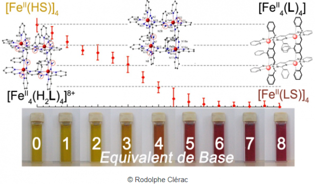 carré moléculaire composé de quatre ions Fe(II), reliés par quatre ligands organiques. En contrôlant l'ajout une base, ils ont retiré progressivement deux protons à chaque ligand, ce qui, d'une façon générale, entraîne la conversion continue des ions fer de l'état haut spin vers leur état bas spin. Lorsque les huit protons disponibles sont éliminés, tous les ions fer sont dans leur état bas spin.